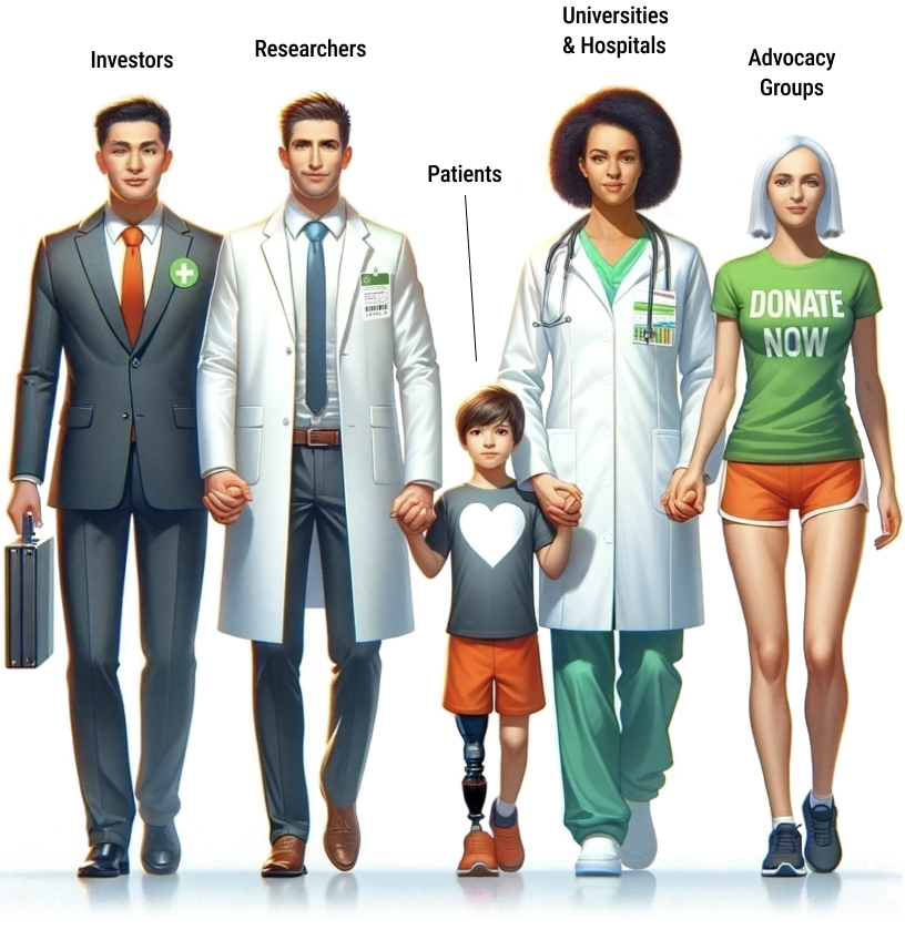 Individuals or family members of those affected by a condition can crowdfund to start their own non-profit org and micro fund using BioCrowd tools, research partner network and support.